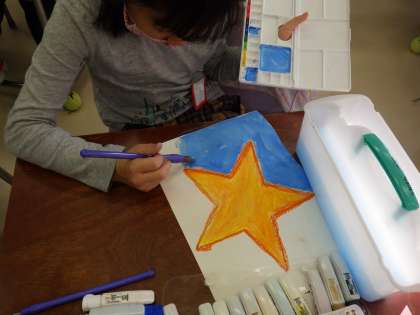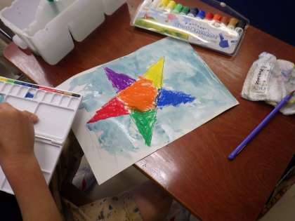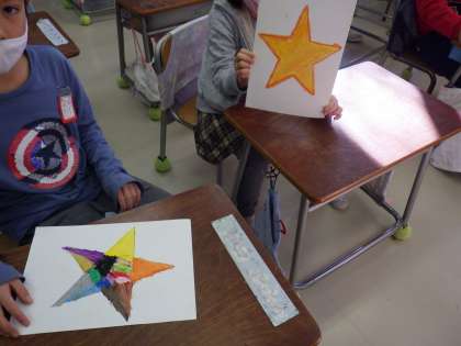 今日は星の形をクレヨンで塗って、その上から背景を絵の具で塗りました。