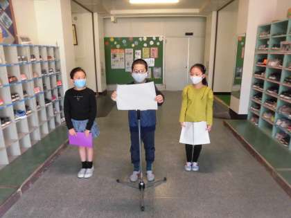 続いて、2年生の学級代表のみなさんが一人ずつ、2学期を振り返っての感想と3学期に向けての意気込みなどを、とても落ち着いて発表しました。発表を聴いた各教室の子どもたちからは、たくさんの拍手が送られ、校内に響き渡りました。