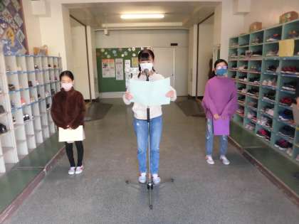 続いて児童代表の言葉として、4年生3名のみなさんが、今年の抱負や3学期に頑張りたいこと・挑戦したいことなどについて、とても上手にスピーチしました。各教室から大きな拍手が送られました。