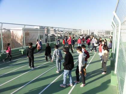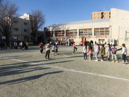 今日は、全校での運動委員会のみなさんが中心となり、「長縄跳び集会」を行いました。感染予防対策として、運動の場を校庭・屋上・体育館に分散し、今日の中休みの時間の割り当て場所で、学級ごとに1本の長縄を使って長縄跳びを楽しみました。1年生から3年生までの各学級へは、運動委員会のみなさんが縄の回し手として加わり、一生懸命に声をかけながら縄を回す姿が印象的でした。