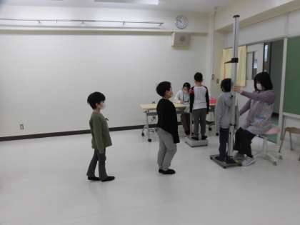 今日は、1年生と2年生の計測を多目的室で、1時間目から4時間目までの時間を使って行っています。