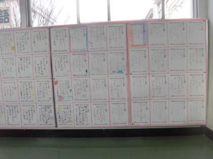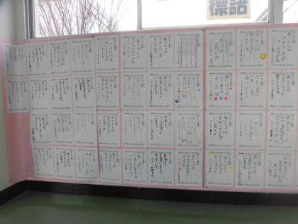 1月の「あいさつ週間」を担当する2年生のみなさんが、あいさつ標語をつくりました。一人一人のあいさつについての思いや願いを込めてつくり上げたすてきな標語が、2階渡り廊下の掲示コーナーで紹介されています。