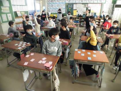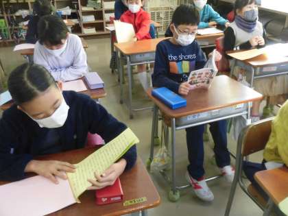 教科「日本語」の学習で、「百人一首」にふれています。31音の響きやリズムを楽しみながら読んでいます。今週は、美しい日本語週間です。朝読書の時間にも、短歌を読んで(覚えて)いました。学習中は、密を避けるために、グループでのかるた遊びではなく、一人かるた取りをしています。「1首でも多く覚えるぞ。」と張りきっています。