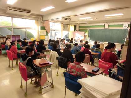音楽朝会の最後にその校歌の演奏を聴き、全校で弦楽器の響きを味わいました。体育館に集まって、全校で校歌を歌うことができる日が待ち遠しいです。