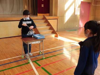 体育館で2年生がおもちゃの作り方を教えてくれました。