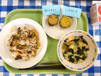 今週一週間は、今朝の校長先生のお話にもあったように、全国学校給食週間です。みなさんにいつも以上に給食を味わってもらえるよう、食べ比べ給食を考えました。今日は「シルクスイート」と「紅はるか」という種類のさつまいもで、焼きいもの食べ比べです。さつまいもは大きく“しっとり”系、“ほくほく”系、“ねっとり”系にわけられるのですが、これらのさつまいもはどれでしょうか?よく味わって食べ比べてみてください。