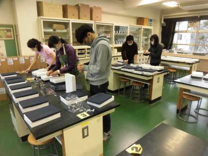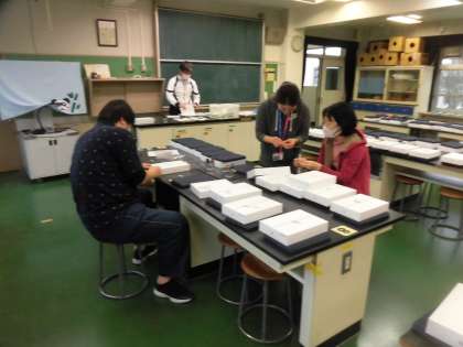 写真は、明日の4年生に配布するための準備作業を理科室で行っている様子です。1人1台の学習用タブレット端末ですが、本体とケースに氏名と整理番号などを記したラベルを貼ったり、配布資料をまとめたり、ICT推進委員会の担当教員が中心となり、全教員で協力して作業をしています。
