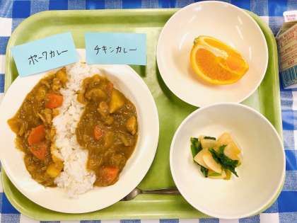 全国学校給食週間4日目は、カレーライス食べ比べ給食です。給食では、毎月のようにカレーライスがでていますが、いつもまったく同じではないことを知っていますか?そのちがいは、お肉です。ぶた肉をつかったカレーライスと、とり肉をつかったカレーライスがあります。今日はなんと、そのふたつを一度に食べられます。どちらのカレーライスが好きか、ぜひ栄養士の先生に教えてくださいね。