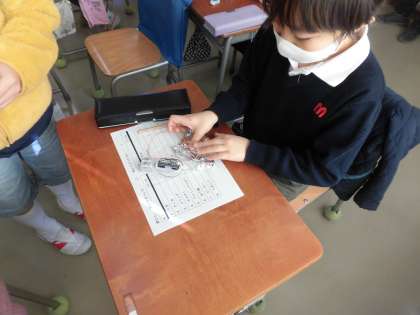 子どもたちは、今までの生活経験を思い出しながら「どのような物が電気を通すのだろうか。」予想を立て、自分で作った回路(1組ではテスターと名付けています)を使って、いろいろな物をテスターの間に入れ、豆電球の様子をワークシートにまとめていきました。