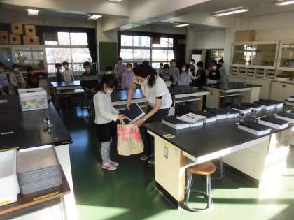 昨日の放課後、教員が配布準備しておいた機材等を、理科室で一人一人に配布しました。教室に戻り、担任から配布物の確認と説明があり、熱心に聴いていました。
