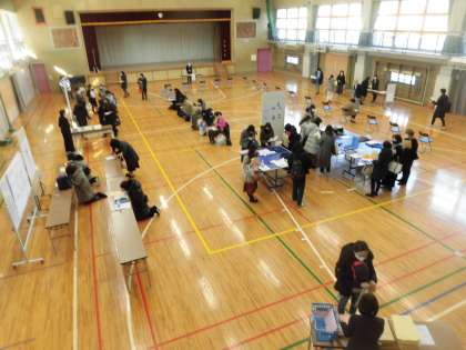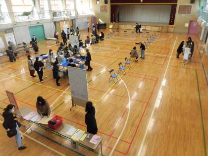 体育館を会場に、配布資料を配付させていただき、提出していただく書類への記入提出、1年生が使用する学用品等の展示見学など、会場を一方通行でまわっていただく流れで説明会とさせていただきました。