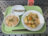 ゆうあん焼きとは、魚や肉を、酒・みりん・しょうゆを合わせた調味料に漬けて焼いた料理のことを言います。ゆずやかぼすなどの絞り汁も入れているので、さわやかな香りがします。今日はゆずを入れてつくりました。芋煮汁は、山形県や宮城県で昔から食べられている郷土料理です。山形県はしょうゆ味、宮城県はみそ味でつくることが多いそうです。