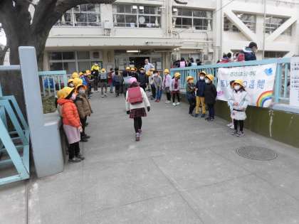 今日は、各学級の出席番号が1番から15番までのみなさんが、正門と中庭に分かれて立ち、あいさつキッズとしての活動を頑張りました。明日は、16番から30番までのみなさんが担当します。