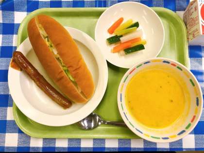 今日から一週間は、展覧会給食です。今日は4年生の作品にちなんだ給食です。4年生は、「夢の世界へ」というテーマで、船にのってどこへ行きたいか想像しながら、ひとりひとり工夫して船をつくりました。給食でも、夢の世界へむかう船をイメージして、ホットドッグをつくりました。船はつくりましたが、まだ肝心の船のかじを取る人が乗っていません。ウィンナーを自分だと思って、かっこよく船にのせて食べてください。