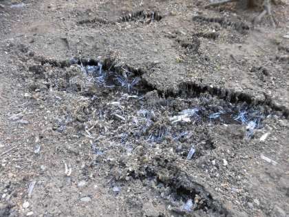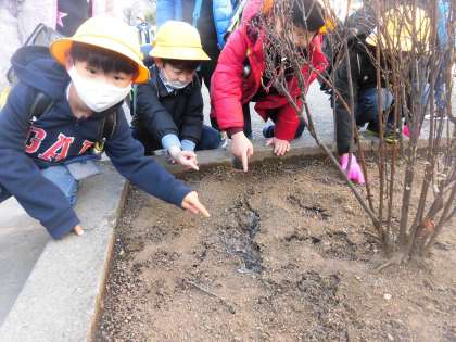 初めて「霜柱」というものを見た人、初めて「霜柱」という言葉を聴いた人など、みんなで土の上から、また、盛り上がっている土を少しはがして輝いている氷の柱を横からなど、不思議な現象を共有することができた子どもたちでした。