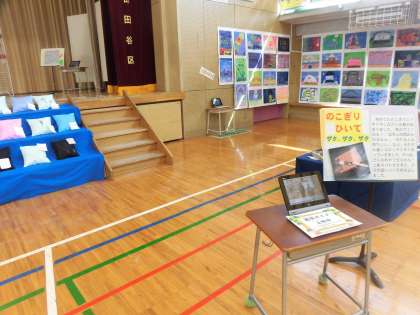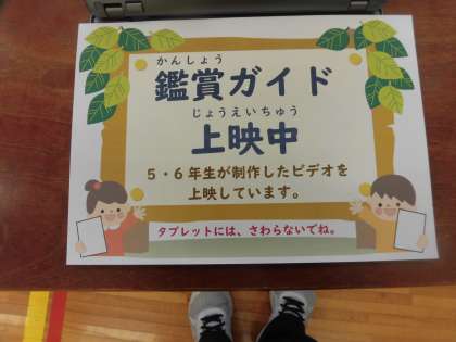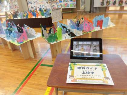本校の展覧会での伝統的な活動の1つに「鑑賞ガイド」があります。今回は、感染対策のため、5年生と6年生の子どもたちが事前に制作した「鑑賞ガイド(展覧会ムービー)」を、各学年及び目の教室のコーナーに設置・上映して、作品の解説をしています。学校で子どもたちが学習で活用している「タブレット型情報端末」を16台使用しています。また、いつでも、何回でも繰り返し視聴できるように設定してあります。