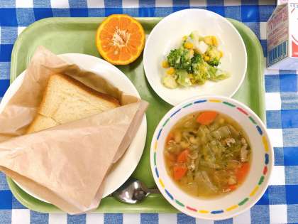 1週間最後の給食は、6年生の展覧会給食です。6年生は毎年、自分が6年間使ってきたランドセルの絵を描いています。そのランドセルには、初めて背負った時のワクワクした思い出や、友だちと話しながら登校した楽しい思い出、嫌なことがあったときの悲しい思い出など、たくさんの思い出が詰まっています。給食では、2枚の食パンの中に6種類の具材を詰めて、ホットサンドにしました。自分の中のたくさんの思い出を振り返りながら、食べてみてください。