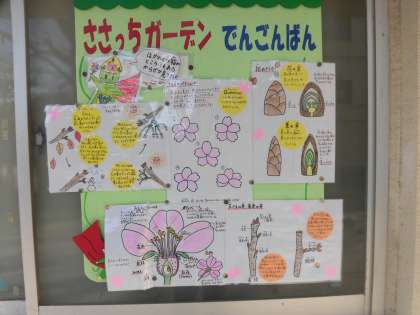 その1つ、環境安全・地域連携部会を担当している委員さんが、「ささっちガーデン」の伝言板を活用して、活動の様子や、今年度は特に植物に関する情報を提供してくださっています。正門から入った正面の掲示板、北校舎東昇降口正面の掲示板、南校舎東昇降口を入った多目的室の掲示板の3か所に、すてきなイラストと解説の入った情報を掲示してあります。