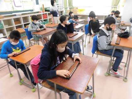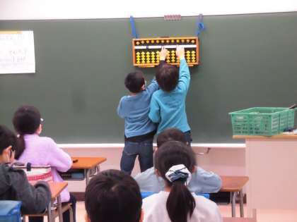算数「そろばん」の学習を始めました。「一だま」「五だま」「はり」「わく」「定位点」の部分名称を知りました。そして、定位点のあるところを一の位にすることを理解しました。教師が提示した数字を読んだり、自分のそろんばんに表したりしました。現代は、計算機の時代ですが、何百年もの歴史を感じたのではないでしょうか。