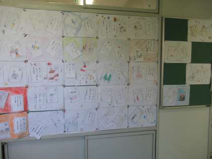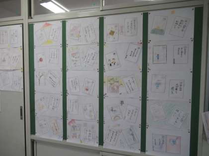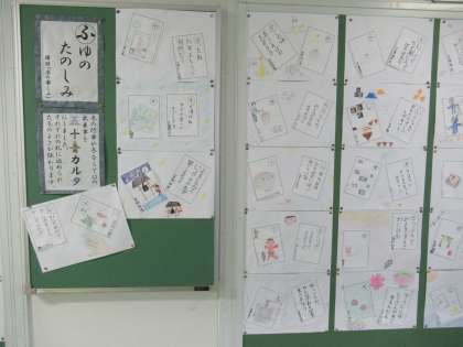 国語「冬の楽しみ」の学習では、冬の行事や冬らしいものを題材として50音かるたを作りました。それぞれが思う冬を絵札と読み札に表し、台紙にに貼りました。廊下に掲示してあります。ご来校の際には、ぜひご覧ください。