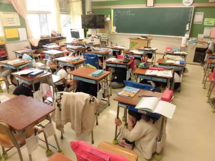 今日の5時間目が始まると同時に大きな地震が発生し、その後の余震発生を想定した避難訓練を行いました。