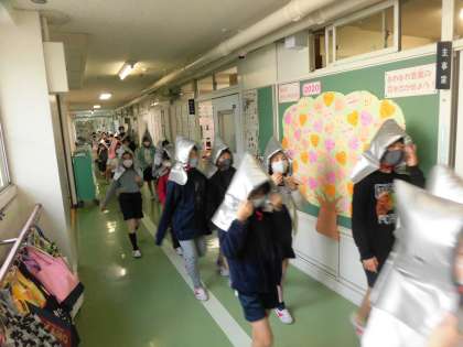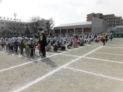 今回は、子どもたちにも教職員にも実施日時を伝えず、1年間のまとめとして、大地震発生を想定した本格的な訓練として行いました。