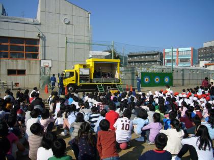 学校では、毎月1回避難訓練を行っています。本日は、休み時間に地震が起きたことを想定し、訓練を行いました。訓練の後、教員数名が区の起震車に乗って、地震のときにどのように対応すればよいかを全校児童の前で示しました。その後、6年生が全員起震車に乗って大地震が来たときの対応を体験しました。いざというときに備え、今日の体験を生かし、落ち着いた行動を取ってほしいと思います。