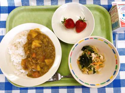 今日は保健給食委員会給食です。保健給食委員会が、健康のためにどのような食事をとったらよいか考え、リクエストを出してくれました。保健給食委員会では、わかめごはんやわかめスープ、わかめサラダなどわかめをつかったメニューが人気でした。