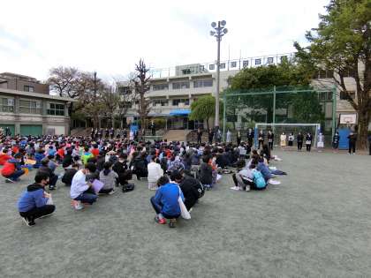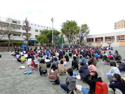 少し早めの登校時間に登校した新2年生から新6年生までの子どもたちは、正門での健康観察を受けた後、校庭で新しい学年の学級編制名簿を受け取りました。新しい学級・新しい友達との新たな出会いと出発です。