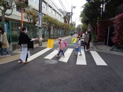 本校では登校時に、通学路のポイントで、保護者の方々が子どもたちの見守りと声かけを行ってくださっています。また、世田谷警察署の署員の方が交差点等を巡回し、子どもたちの登校の様子を見守ってくださっています。