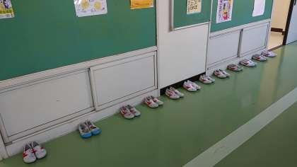 上履きは多目的室前の廊下に間隔をとってきれいに並べています。