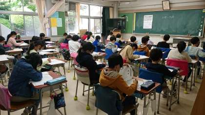 今日の午前中は4〜6年生は学習習得確認調査ということで、1校時は国語、2校時は算数、3校時は社会、4校時は理科です。