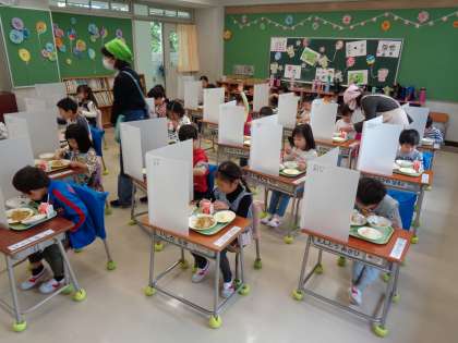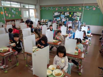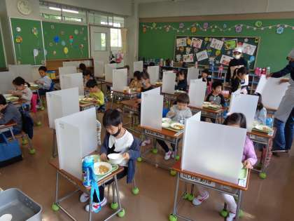 食事の際にはマスクをはずすので、会話は行わないことになっています。子どもたちは、約束を守って食事を進め、困ったことや相談したいことがある場合には、手を挙げて担任や小1サポーターに伝えていました。
