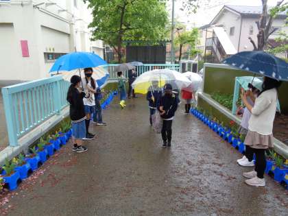 雨が激しく降ってきたため、少し早めでしたが、8時に昇降口へ入るよう放送で案内をしました。