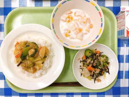 中華丼には、いろいろな食材が入っています。その数はなんと11種類!みなさん全部見つけられたでしょうか? 豚肉、えび、いか、キャベツ、にんじん…ぜひいろいろな食材を見つけて味わって食べてみてください。