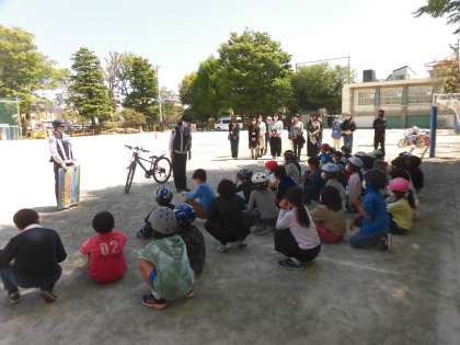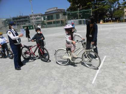 初夏を思わせるような陽気の中、交通安全教室(自転車訓練)が行われました。世田谷警察署交通総務課の方々に、自転車を乗る時の注意点やルールを話していただきました。その後、一人一人が校庭に設定されたコースを実際に自転車に乗って訓練しました。止まったり、右左右後ろを確認したりするポイントには、保護者・校外委員の方々に立ってチェックしてもらいました。「ジグザグコースが難しかった。」「きちんと乗れたよ。」と子どもたちは、振り返っていました。これから、安全に気を付けて自転車に乗ってほしいと思います。世田谷警察署の方々、3年生の保護者の方々、校外委員の方々、本日はありがとうございました。
