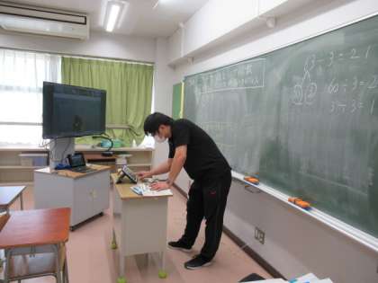 担任は、算数学習室で授業を行い、Zoomを使って各教室にいる子どもたちに配信し、子どもたちは各教室の自席で学習に取り組む、という形態で実施しました。各教室には、支援を行う教員を配置し、子どもたちの学習活動をチェックしたり、状況に応じて支援したりしました。