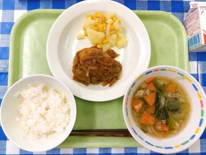 今日は豆腐の入った、ヘルシーなハンバーグです。給食室でたまねぎをじっくり炒めてから、お肉と豆腐と合わせています。そしてそれを、530個分ひとつひとつ心を込めて丸くしています。手間暇かけて作っているので、感謝していただきましょう。