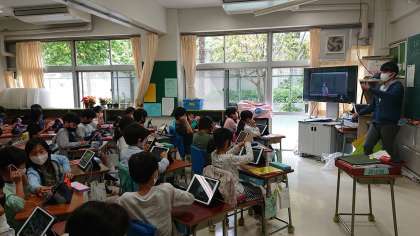 子どもたちは学習用タブレット端末とイヤホンの準備をして待ちます。