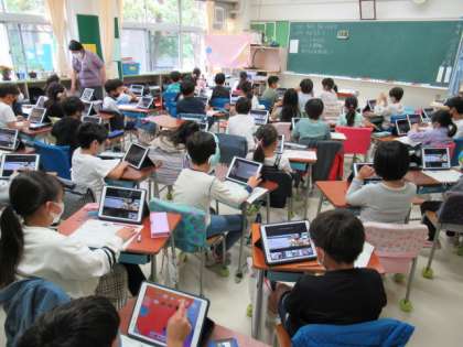それぞれの教室には、教員が2人から3人入り、タブレット型端末の操作や学習活動への支援にあたりました。