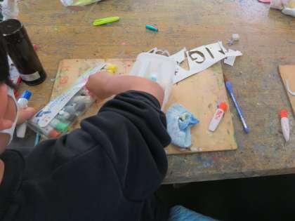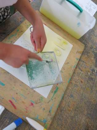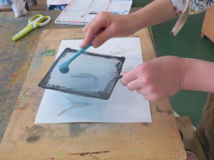 図工の学習では、絵の具を付けた歯ブラシをごしごしと網の上でこすっていました。すると下にある紙に素敵な模様ができていきます。不思議な模様の描き方で、作品の完成が楽しみです。子どもたちも思い思いに色を組み合わせるなどの工夫が見られるなど楽しそうに取り組んでいました。