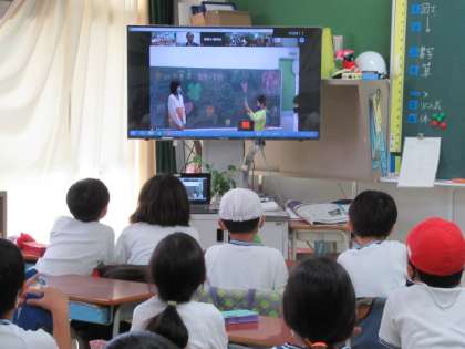 算数学習室での離任された方々へのメッセージと、離任された教職員からのあいさつを、Zoomで配信された映像を視聴し、話を聴き、最後には全校で大きな拍手を送りました。