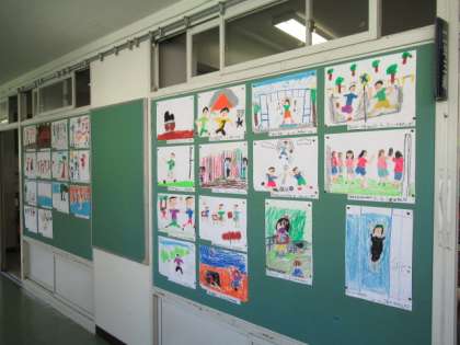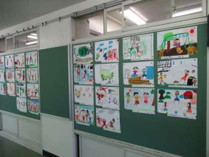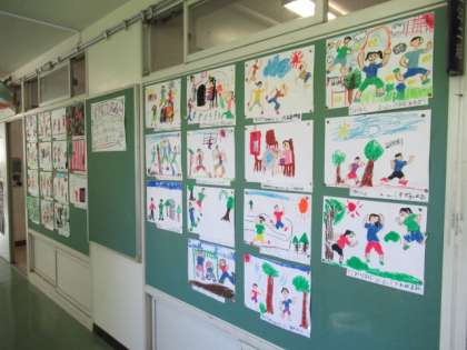 2年生の各教室の廊下掲示コーナーでは、図工の学習で取り組んだ「すきなこと なあに」の作品が展示されています。