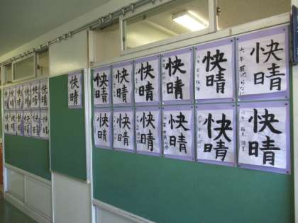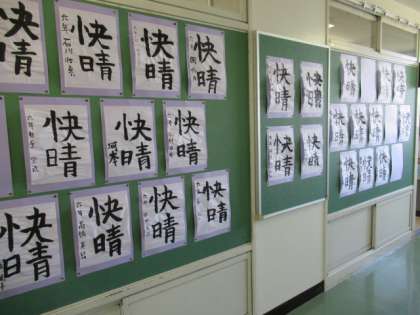 6年生の各教室の廊下掲示コーナーには、6年生に進級して最初の書写の時間に書いた作品「快晴」が展示してあります。