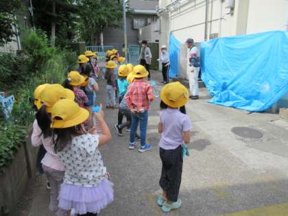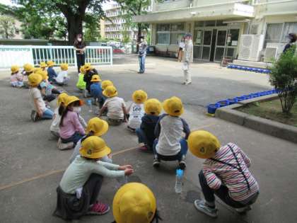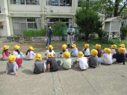 子どもたちは、アサガオの水やりで使っているペットボトルに水を入れ、植えた後にまく水を用意して話を聴きました。