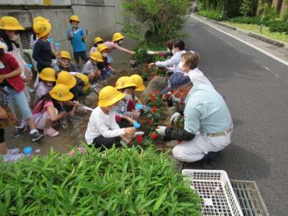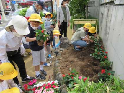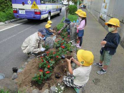 学級ごとの花壇で、サルビアと日日草の2種類の花を、一人ずつ順番に植えました。とても美しい花なので、子どもたちも丁寧に花植をし、最後に水まきをしました。上手に植えられてとても嬉しそうでした。