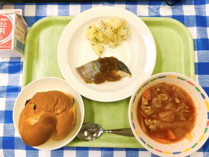給食室には、笹原小学校全員分の給食をつくるために、大きな鍋や機械がたくさんあります。おふろみたいに大きなお鍋を3つつかって、スープやパセリポテトをつくりました。お魚は、オーブンで焼きました。家のオーブンは1段か2段のものが多いですが、給食室のオーブンは10段もあります。