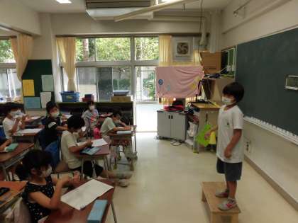 国語「もっと知りたい、友だちのこと」の学習で、自分の好きなことや趣味、家族のことなどについてのスピーチをしました。「はじめ・なか・おわり」の三段構成に気を付けて、原稿を作成しました。発表に向けて、それぞれが話す時や聞く時のめあてを考え、達成するために一生懸命練習しました。一人一人のこともたちが笑顔で話す姿が印象的です。