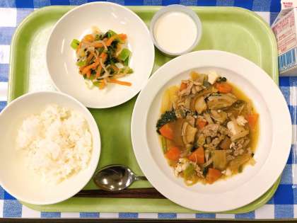 今日は聖火リレー給食で、滋賀県にちなんだ料理です。滋賀県は、近江牛というブランド牛が有名です。その近江牛をつかったすきやきは、とてもおいしく、多くの人に愛されています。今日は和牛ではありませんが、すきやき風の煮物をつくりました。甘辛い味付けで、ごはんが進むおかずです。