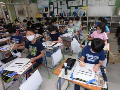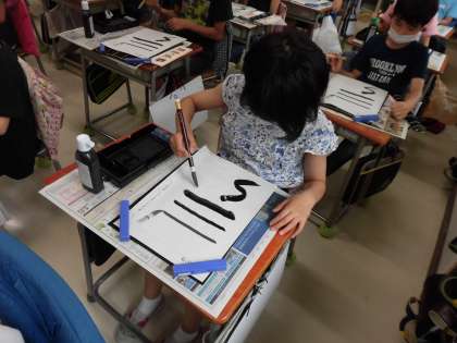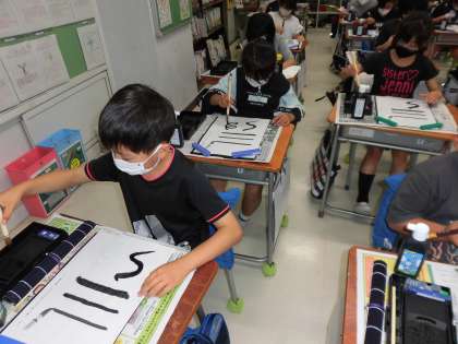 毛筆での書写を初めて行いました。昨日から、楽しみにしている様子が感じられました。素晴らしいことに、習字バッグを忘れた子は0(ゼロ)でした。準備の仕方や筆の持ち方、片付け方を学習してあっという間に時間が過ぎました。墨液を硯にいれるとき、「なんか緊張する。」線を書くとき、「うまくいった。」という声が聞こえました。これからの習字の学習が楽しみです。
